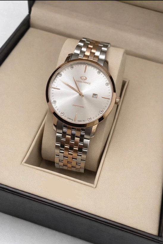 ساعت مردانه سویس پرنس با ترکیب رنگ سفید و طلایی، ظاهری شیک و کلاسیک ارائه میدهد که نگاهها را به خود جلب میکند. این مدل با تمرکز بر کیفیت ساخت بالا و جزئیات دقیق طراحی، از ظاهر لوکس برخوردار است و برای استفاده روزمره و موقعیتهای رسمی بسیار مناسب است.