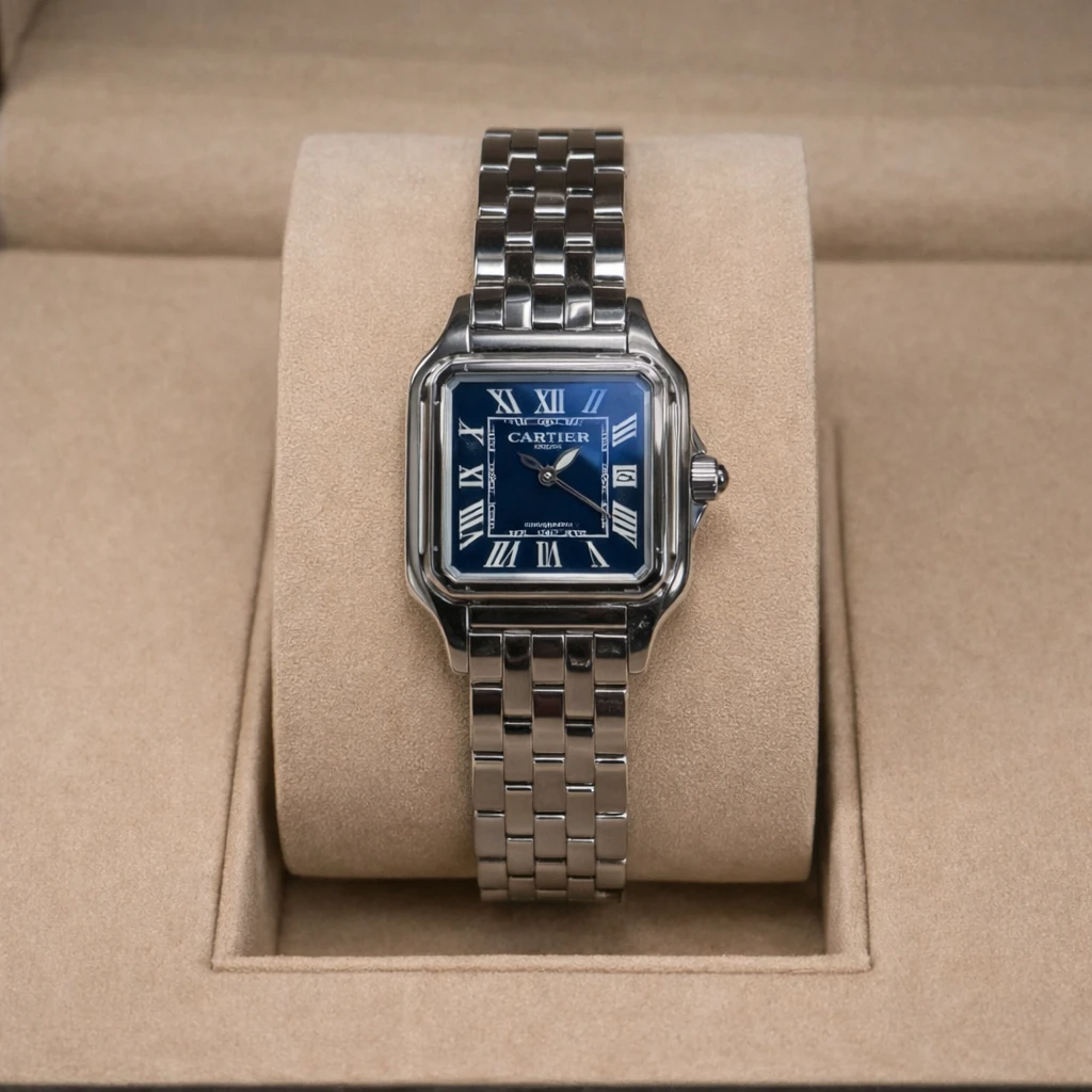 ساعت زنانه کارتیر سانتوس با صفحهی آبی درخشان یکی از زیباترین ترکیبهای رنگی را در بین ساعتهای زنانه ارائه میدهد. رنگ آبی نهتنها چشمنواز است، بلکه حالتی از وقار و لطافت را نیز منتقل میکند که برای استایلهای رسمی و مجلسی بسیار مناسب است.